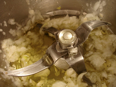 Poner la cebolla y el ajo en el vaso y dar un par de golpes de turbo, bajar los restos con la espatula y añadir el aceite, programar 5 minutos Varoma velocidad 2.