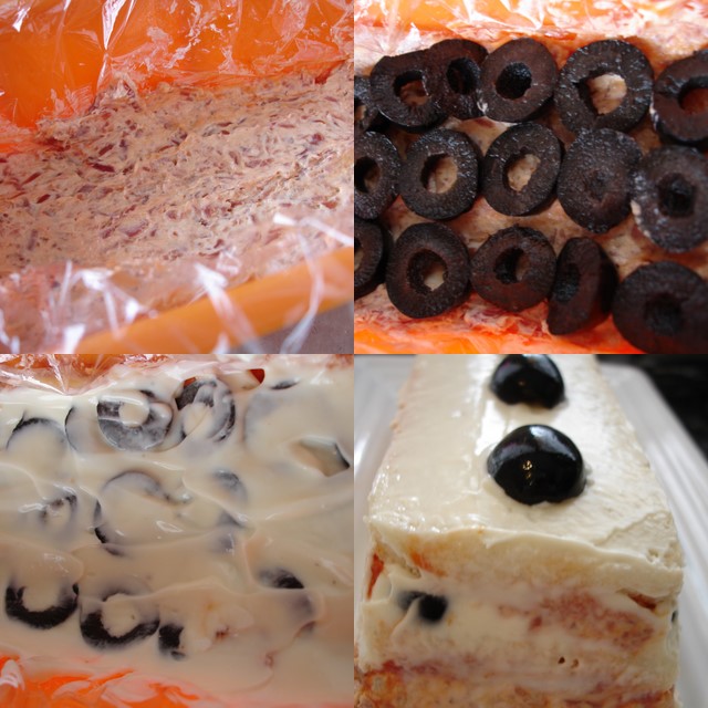 - Empezamos por una de pan de molde que untaremos con tomate frito, colocamos el relleno, ponemos los aros de oliva, mahonesa y seguimos montando acabando con pan de molde.